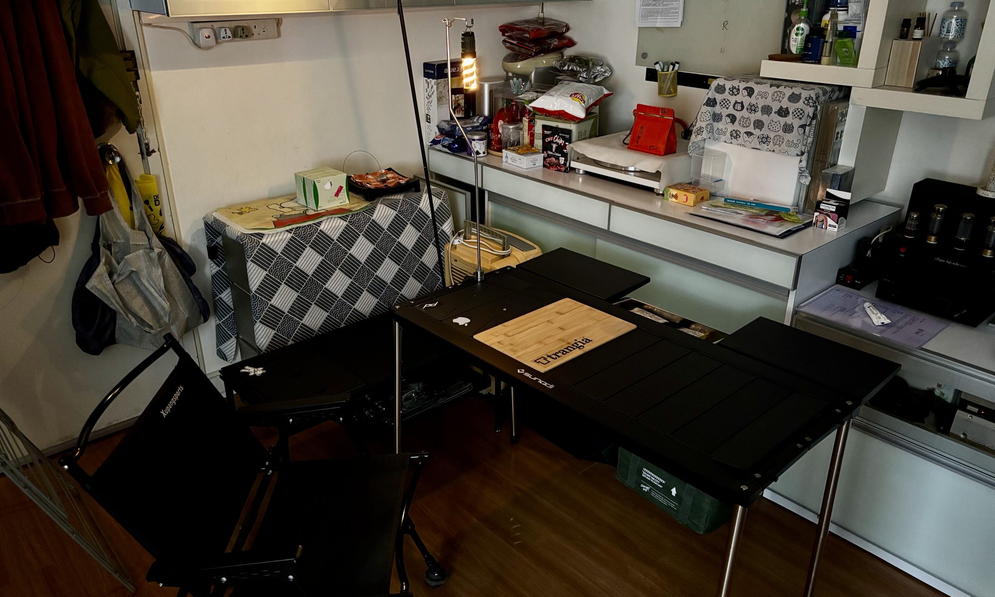 • 多功能桌/工作區: 中央的黑色折疊桌(可能是露營或戶外用)看起來非常堅固和多變,似乎可以組合不同的組件。上面的 Trangia 砧板(或其他品牌)讓人猜測您可能是在準備或整理烹飪裝備。